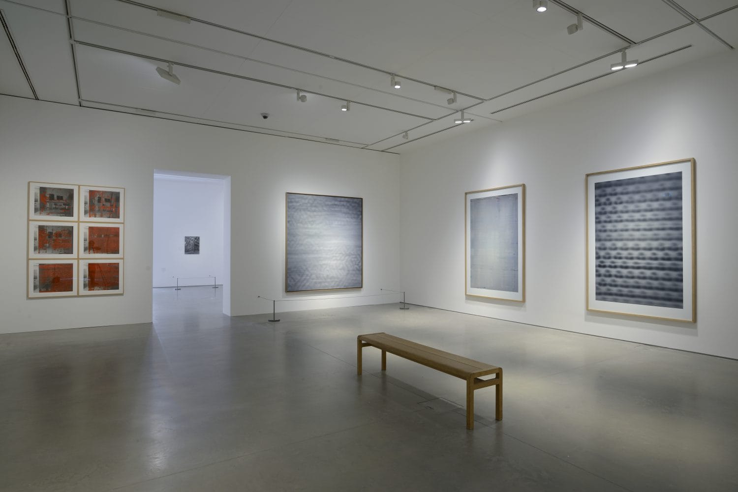 The exhibition opens with a series of works where Richter experiments with abstraction and the impact of photographic and digital reproduction. A group of four large tapestries, Abdu, Iblan, Musa, and Yusuf (all 2009), are based on Richter’s Abstract Painting (724–4) (1990). Each tapestry reproduces a quarter of the painting, mirroring it and repeating it four times to produce Rorschachlike visual suggestions. Abstract Painting No. 439 (1978) is presented together with its original sketch, Oil Sketch no.432/11 (1977), that Richter photographed, projected and reproduced as a careful facsimile, four times the size. With Abstract Painting (809–3) (1994), Richter has pressed, squeezed and scraped paint across the surfaces to form horizontal and vertical bands that are reminiscent of out of focus imagery and photographic motion blur.