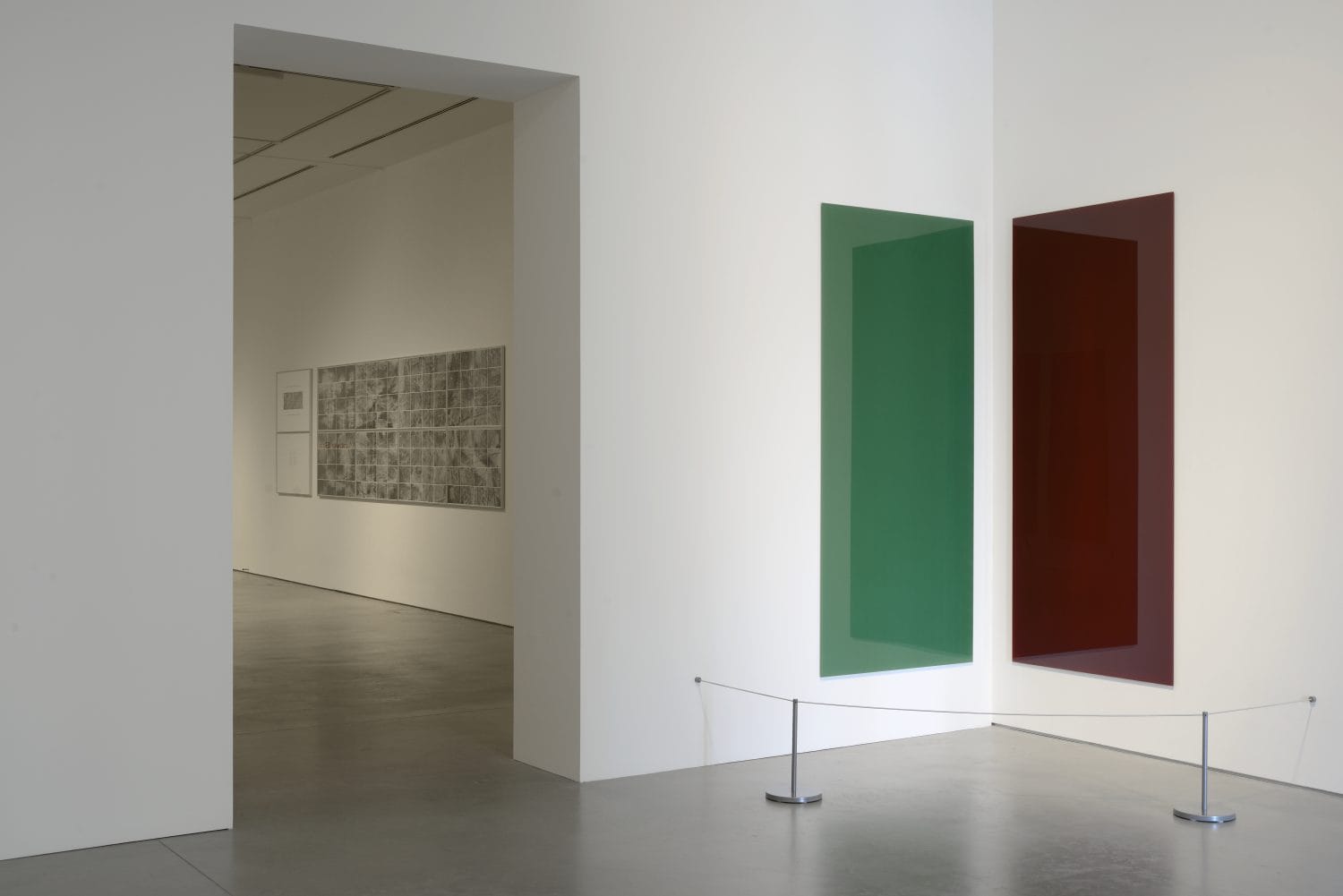 Upstairs in the Gallery, Mirror Painting (Grey, 735–2), Corner Mirror, brown-blue (737–1, 737–2), Corner Mirror, green-red (737–2 A, 737–2 B) (all 1991), create a contemplative space where the viewer is reflected, silhouetted and brought into the picture plane. Corresponding with these, in Self-Portrait, Three Times, 24.1.90 (1990) and Self Portrait Standing, Three Times, 17.3.1991 (1991) Richter brings himself into the frame through a series of ghosted self-portraits within overpainted photographs of his studio. Abstract Painting (Silicate) (880–4), Abstract Painting (Grey) (880–3) (both 2002) and Abstract Painting (Skin) (887–3) (2004) continue with Richter’s consideration of patterns, visual vibrations and neutral space. Examples of Richter’s re-photographed works and editions behind glass, 14.Feb.45 (2002), Mustang Squadron (2005) and September (2009), further invite the viewer into the picture plane, becoming implicit within the history represented.