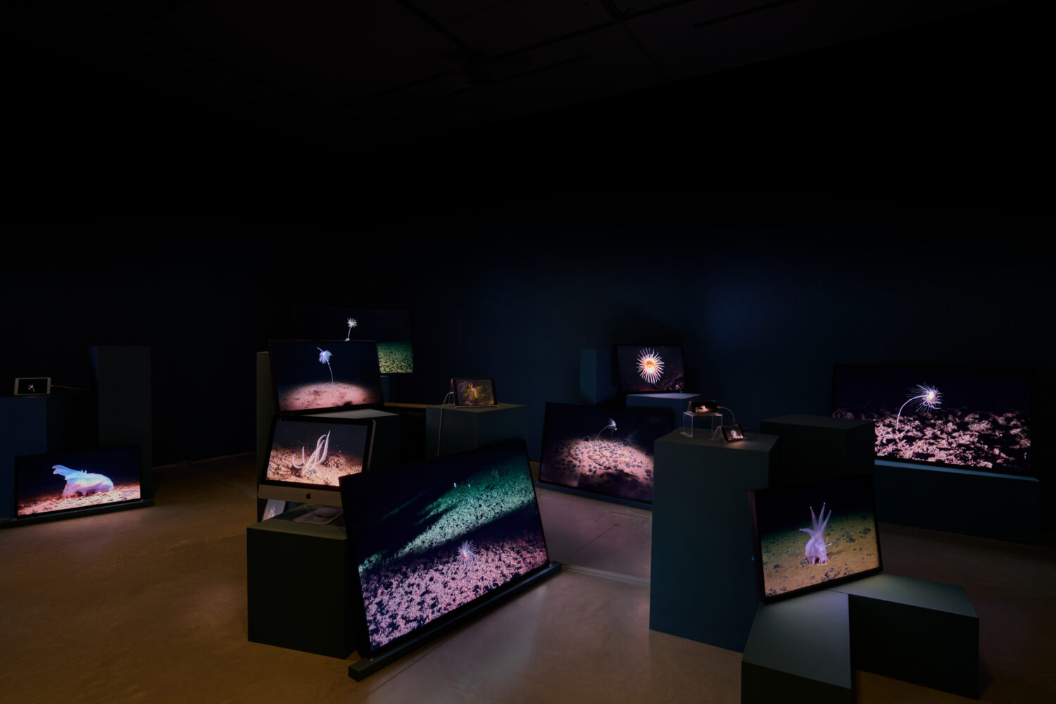 On certain days during the exhibition, a dancer will activate the installation by encountering and moving with deep-sea creatures on the screens. Created in collaboration with dancer Maya Carroll and choreographer Siobhan Davies, these performances use movement and music to create a profound emotional bridge to the deep ocean. The installation offers a space for dialogue, debate, and contemplation.