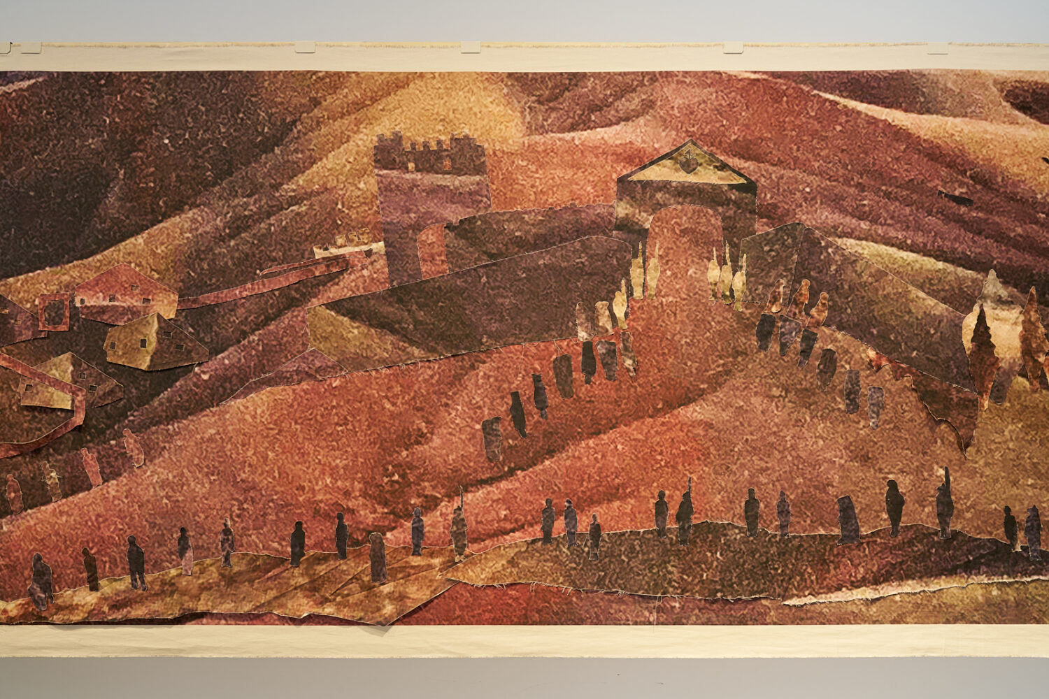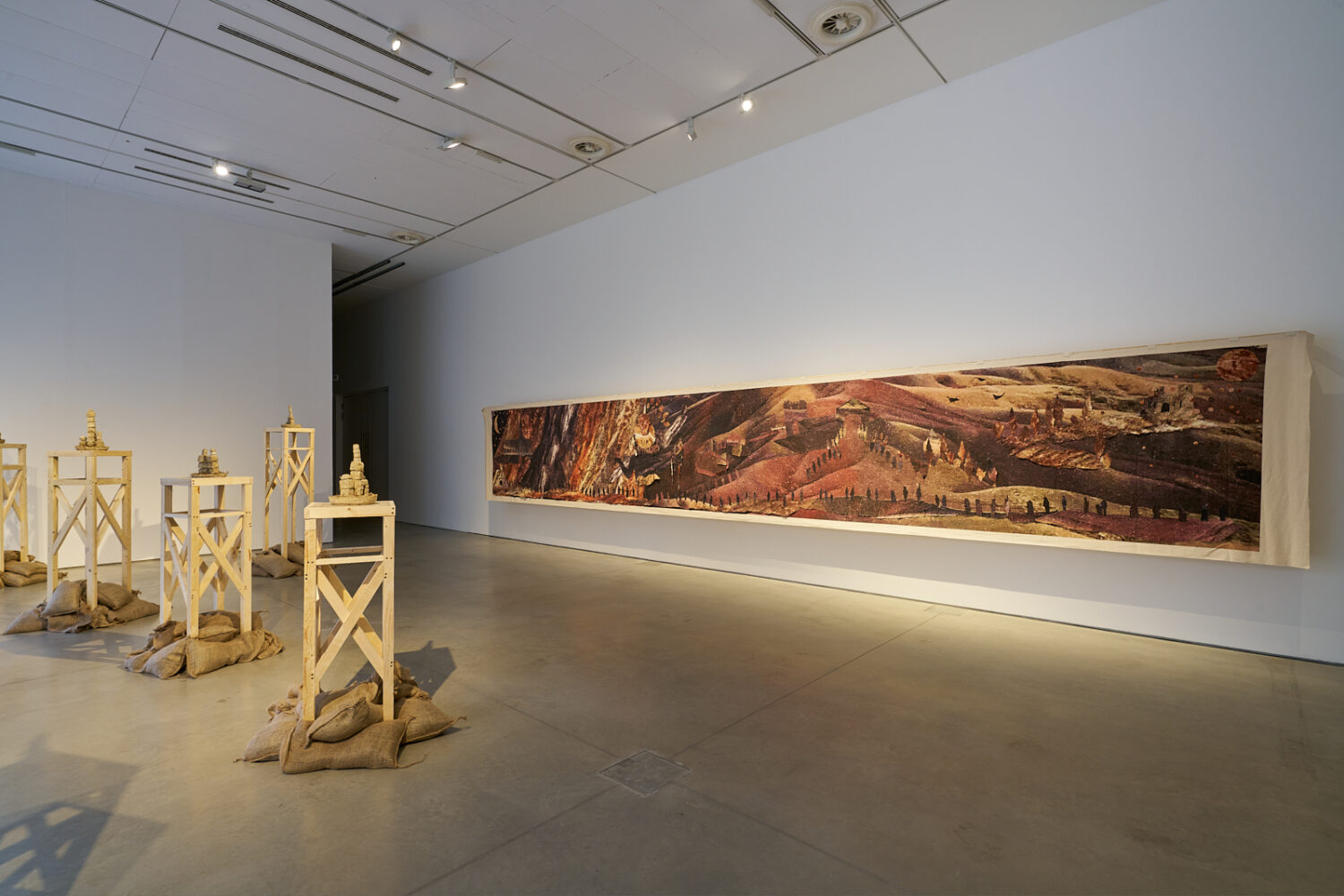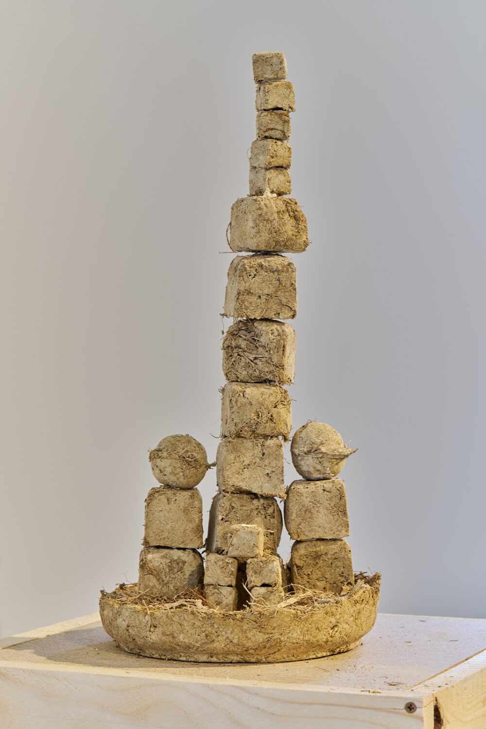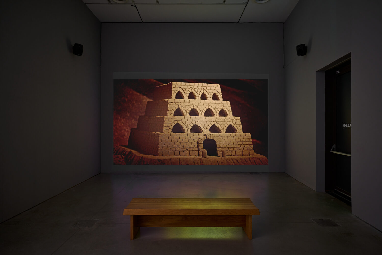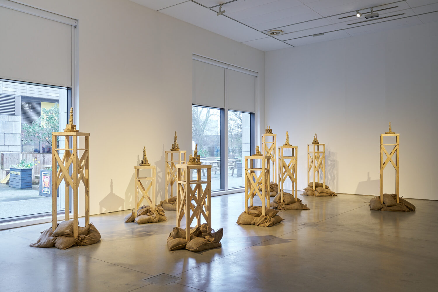The exhibition comprises a multipart installation bringing together moving image, photography and sculpture. Moving images permeate the presentation, depicting sand sculptures emulating colonial architecture in Mauritius. A large-scale composite panorama gives micro and macro perspectives on deep time, colonial history, and contemporary treatment of immigrants, whilst new sculptural objects made from bagasse (a by-product of sugar production), further evokes colonial power and its symbols. Layers of time and geological strata are revealed through references to the coloured earth and sand in Mauritius and Alum Bay on the Isle of Wight.