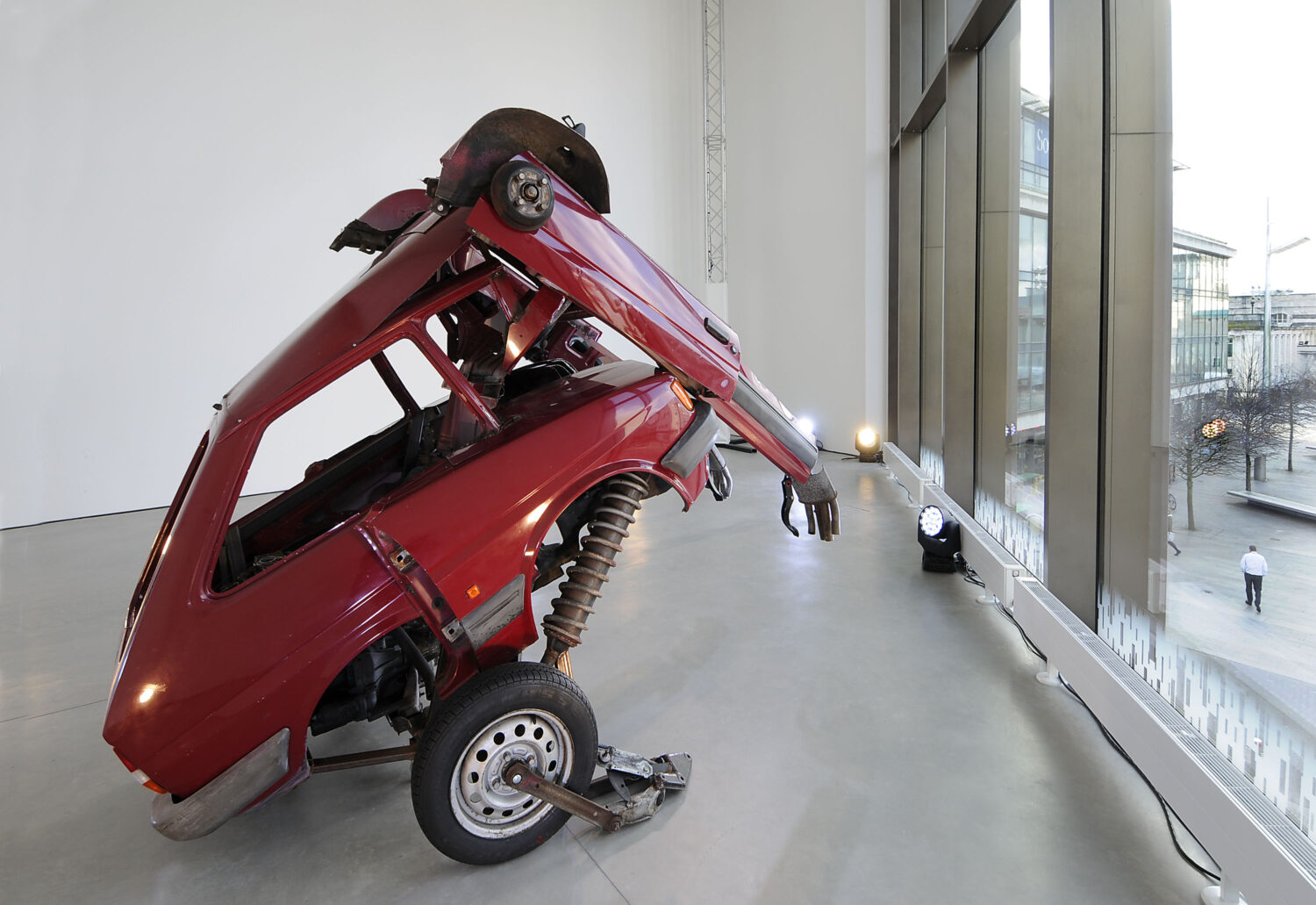 JHG Sampler includes three projects by Hetain Patel. Don’t Look at the Finger is a video that follows a man and a woman as they communicate through complex choreography combining Kung Fu and sign language. ‘The Jump’ is a video installation showing two different viewpoints of Hetain wearing a homemade Spider-Man costume and leaping in super-slow motion across the screen. Fiesta Transformer is a sculpture that transforms a replica of Hetain’s first car, a 1988 Ford Fiesta, into a large-scale squatting humanoid figure.