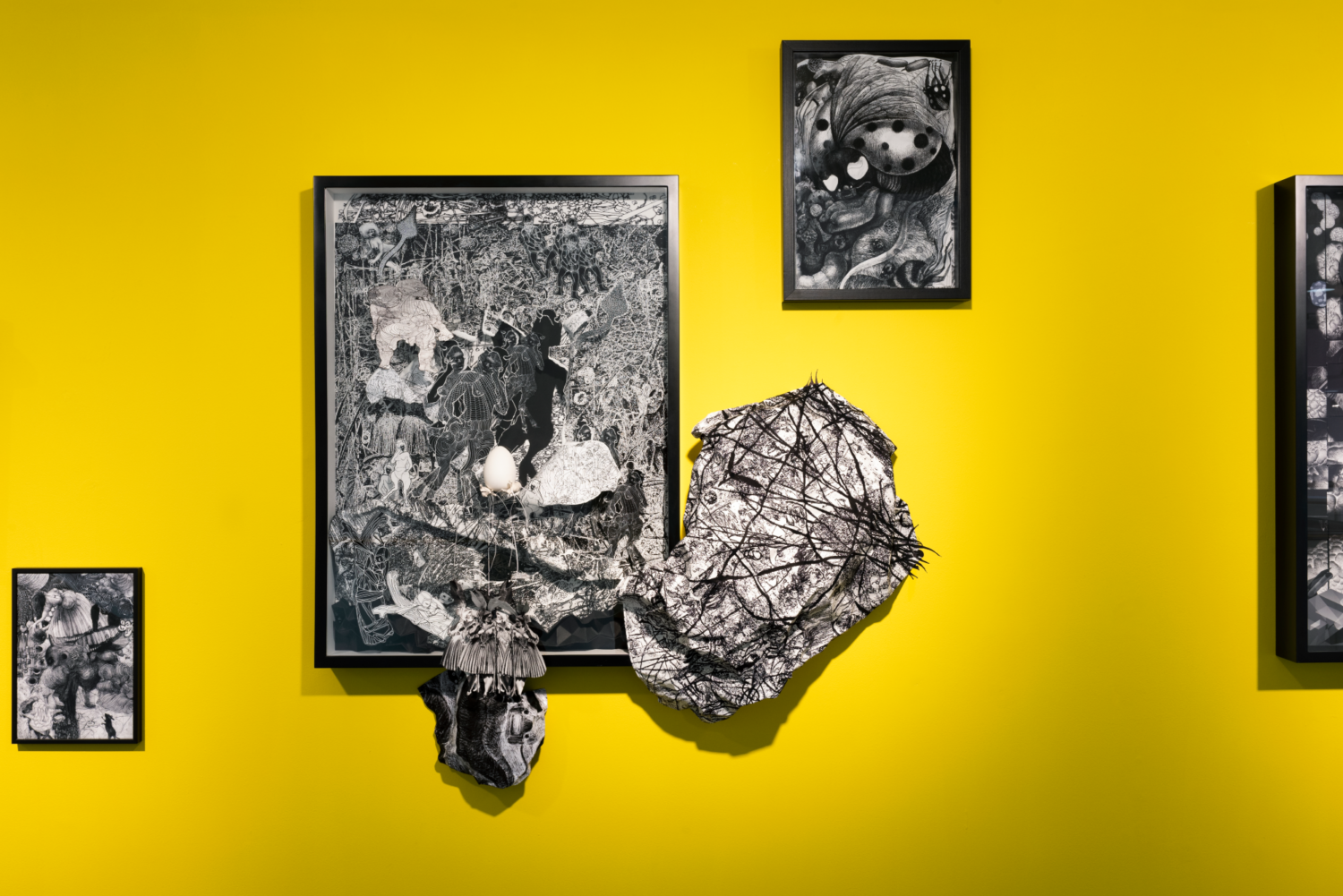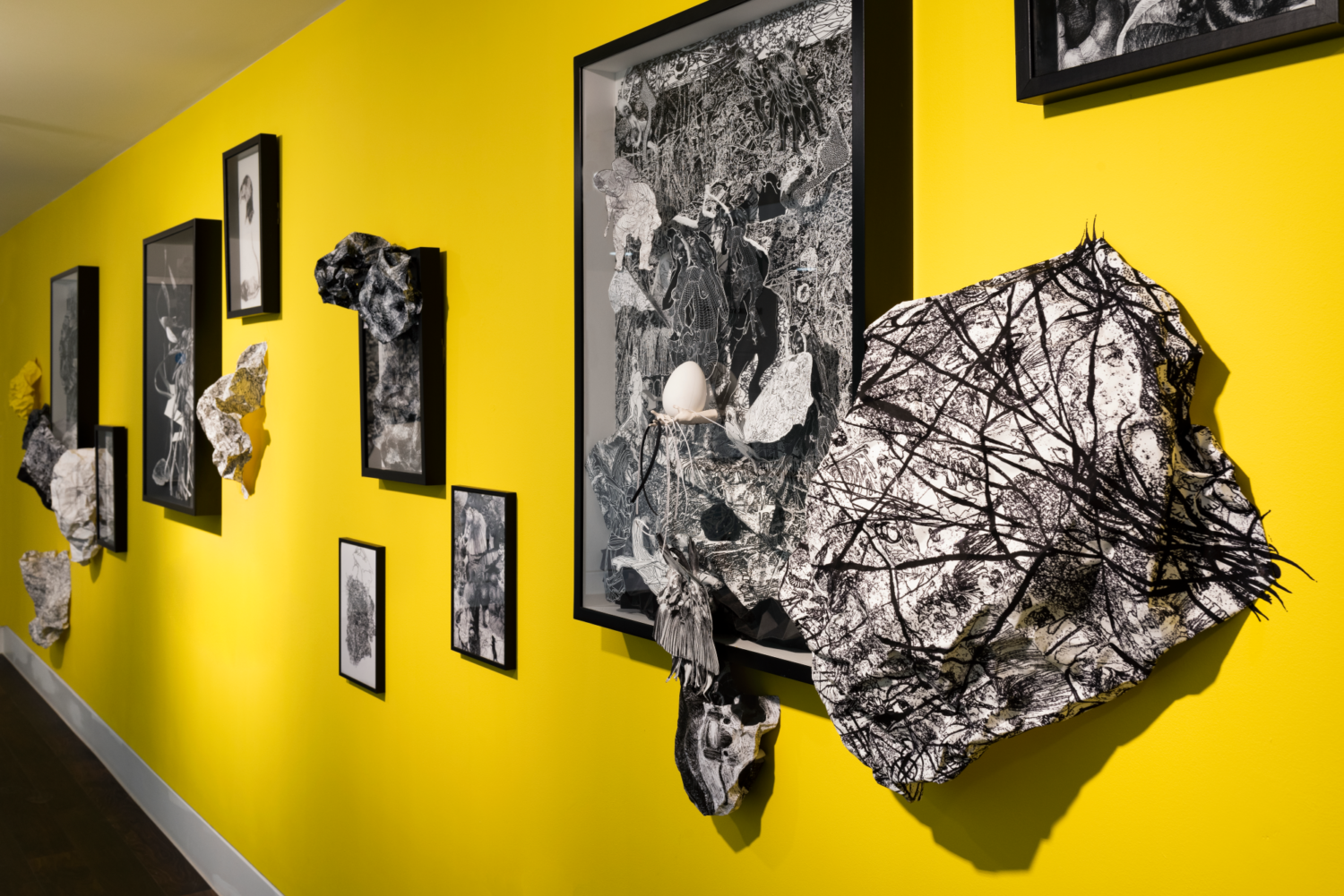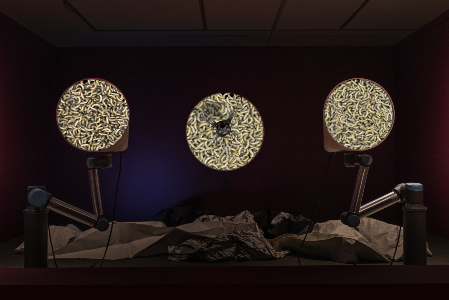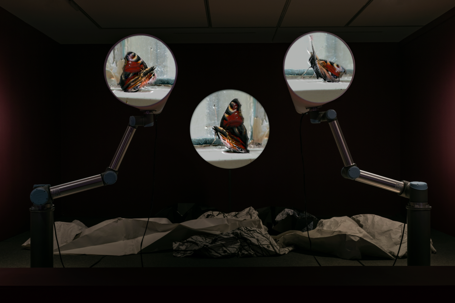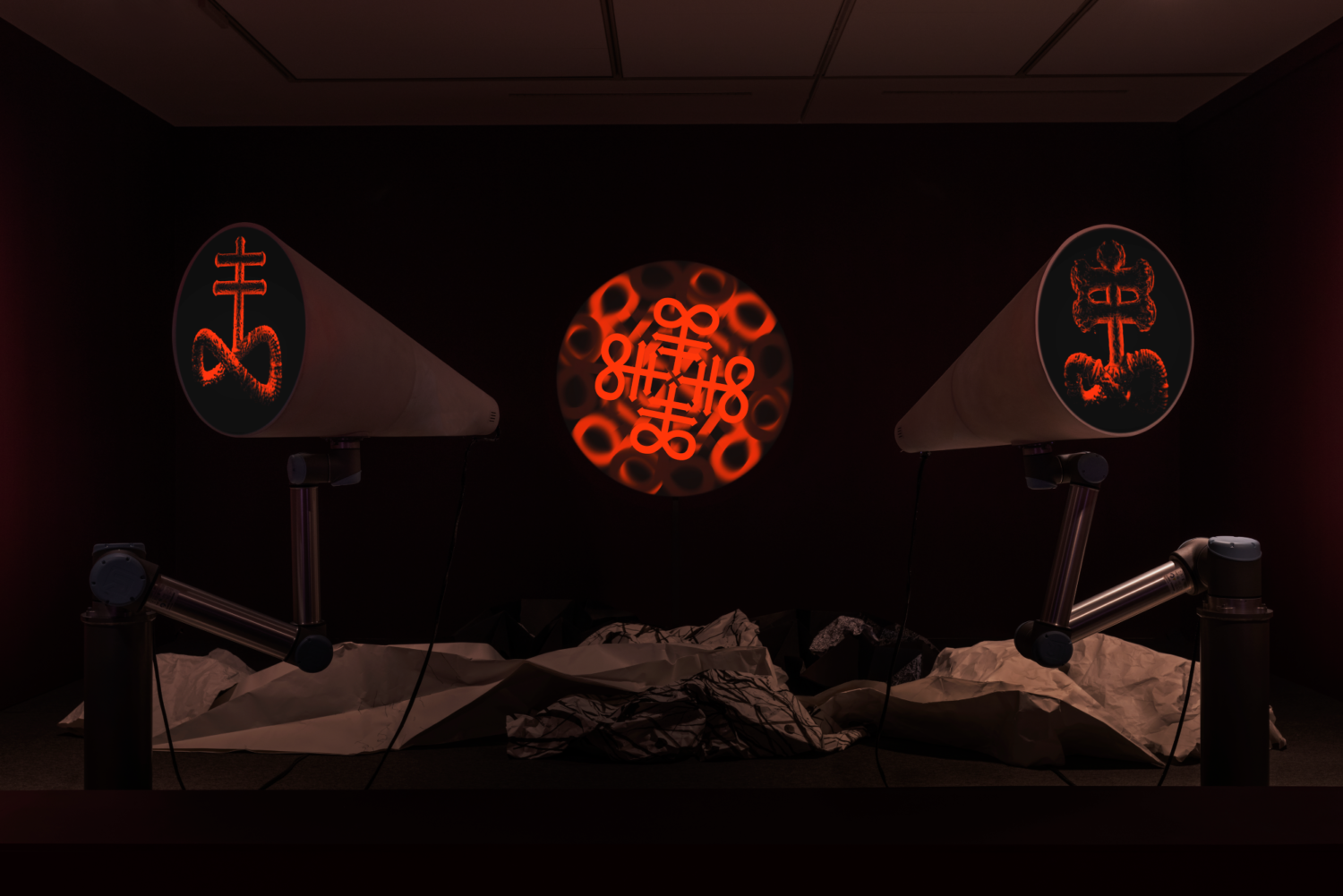 Every Thought There Ever Was reflects on the other-worldly brain functioning that occurs in schizophrenia as an organic difference. The artwork is layered with intense subjective experiences relating to the historic and contemporary understanding of hallucination and psychosis. When you enter the exhibition, two screens, supported by robot arms, move with the images bringing agency to them as active elements in the work. The screens themselves become robotic protagonists, moving with coloured lights which animate paper sculptures, alongside a dense audio-track from seven channels seeming to be both inside and outside of the viewer’s mind. Has the virtual overwhelmed the actual?