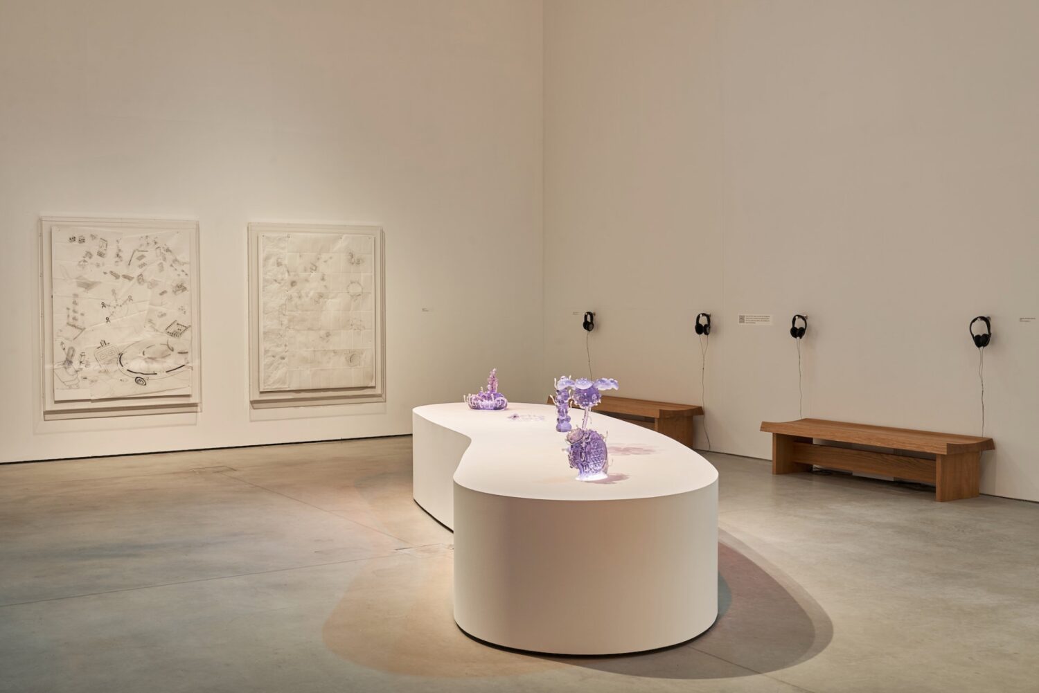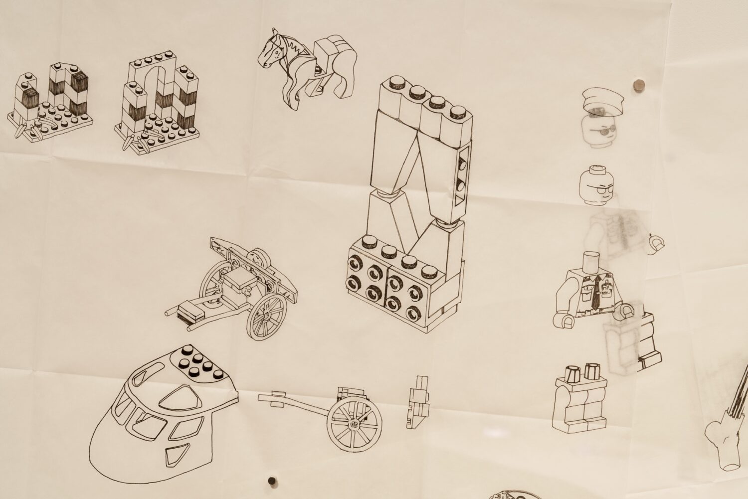 To accompany the film, Sylvestre has created clear resin sculptures and diagrammatic drawings. Memories of Sweet Sea toys amalgamate with components from contemporary cochlear implants. Illustrations for the assembly of these implants overlap Lego construction diagrams in Sylvestre’s new drawings. The structure of language within a family is made visible as an investigation of overlapping systems. Also explored in the exhibition is the role of description in creating access. Silent screens and audio tour headsets bring additional layers of imagery, sound, access and interpretation.