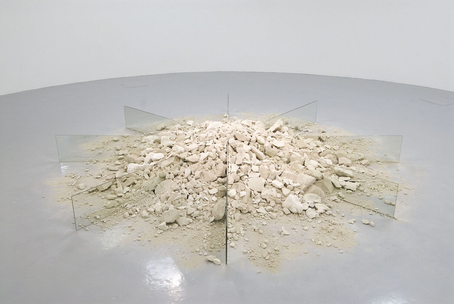 Robert Smithson is represented by exhibition prints of original Slideworks, most notably his Mirror Displacement series. Here, Smithson would photograph arrangements of seven or eight elongated rectangular mirrors in various locations, the exposed mirrors capturing in their reflections fragments of nature nearby, such as rocky quarry crevices, grassy mounds and empty stone beaches. A museum replica of his Non-Site sculpture Chalk Mirror Displacement has been made with chalk mined from the same Oxted quarry where Smithson gathered the chalk for this sculpture in 1969.