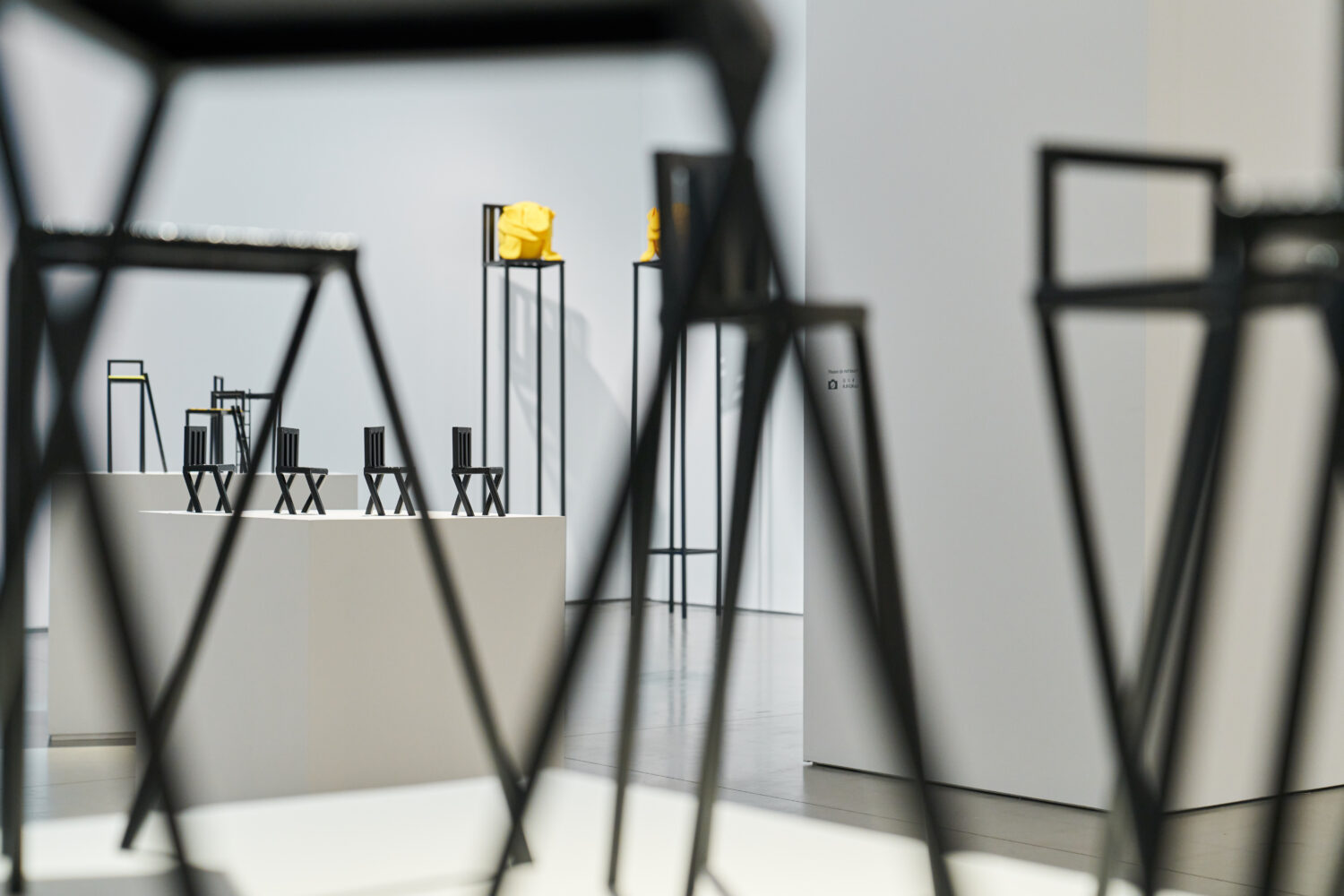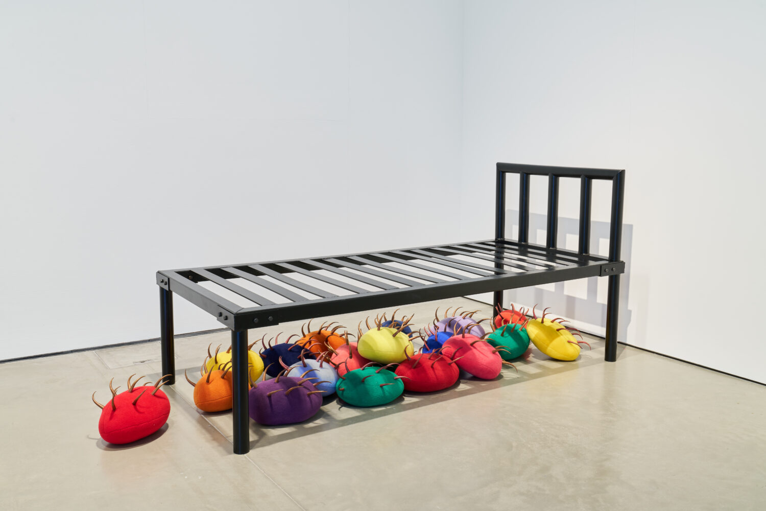 Contrastingly, miniaturised representations of everyday furniture and domestic scenes are placed throughout the space, creating multiple levels of questioning and unease. Reflecting her career long interest in the home, Untitled Bed (2020) and Tall Chairs (1996) provide further uncomfortable domestic contexts.