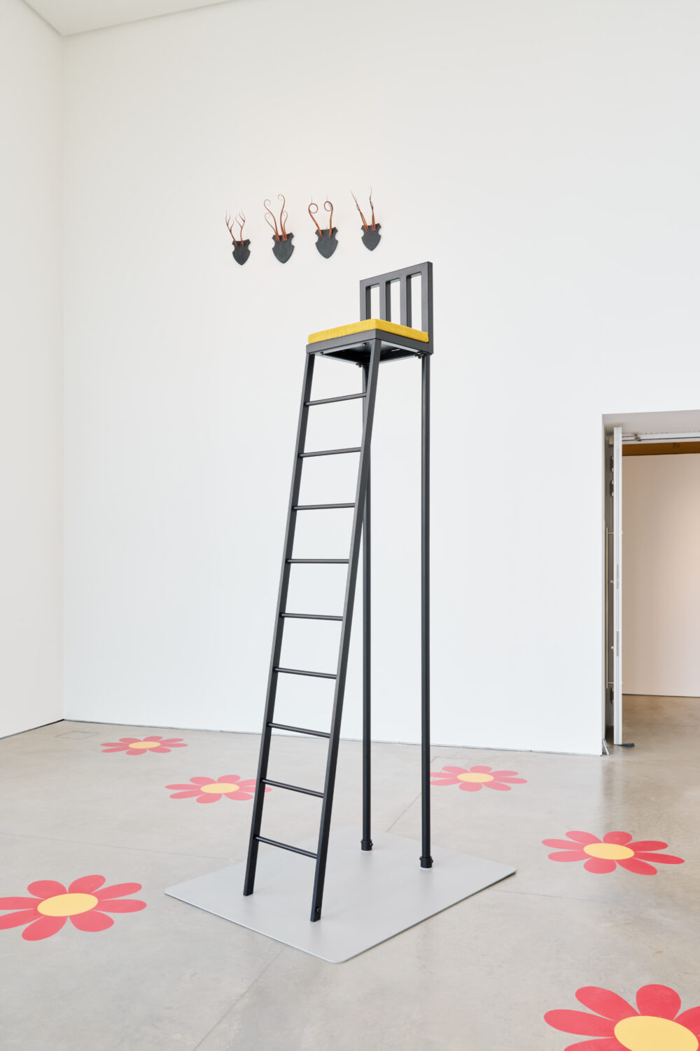 In the gallery’s tallest space, with its large glass windows looking over Southampton’s Guildhall Square beyond, Kaur explores an outdoor aspect of a particular domesticity, hunting. This new commission dominates the space. An exaggerated and oversized tall hunting chair towers within the gallery, facing out and looking across the public square beyond. Contrasts between interior and exterior, playfulness and menace again create an interrogating unease. This major new sculptural piece, alongside the Camouflage works provokes more unease, who is hunting? Who is hiding?