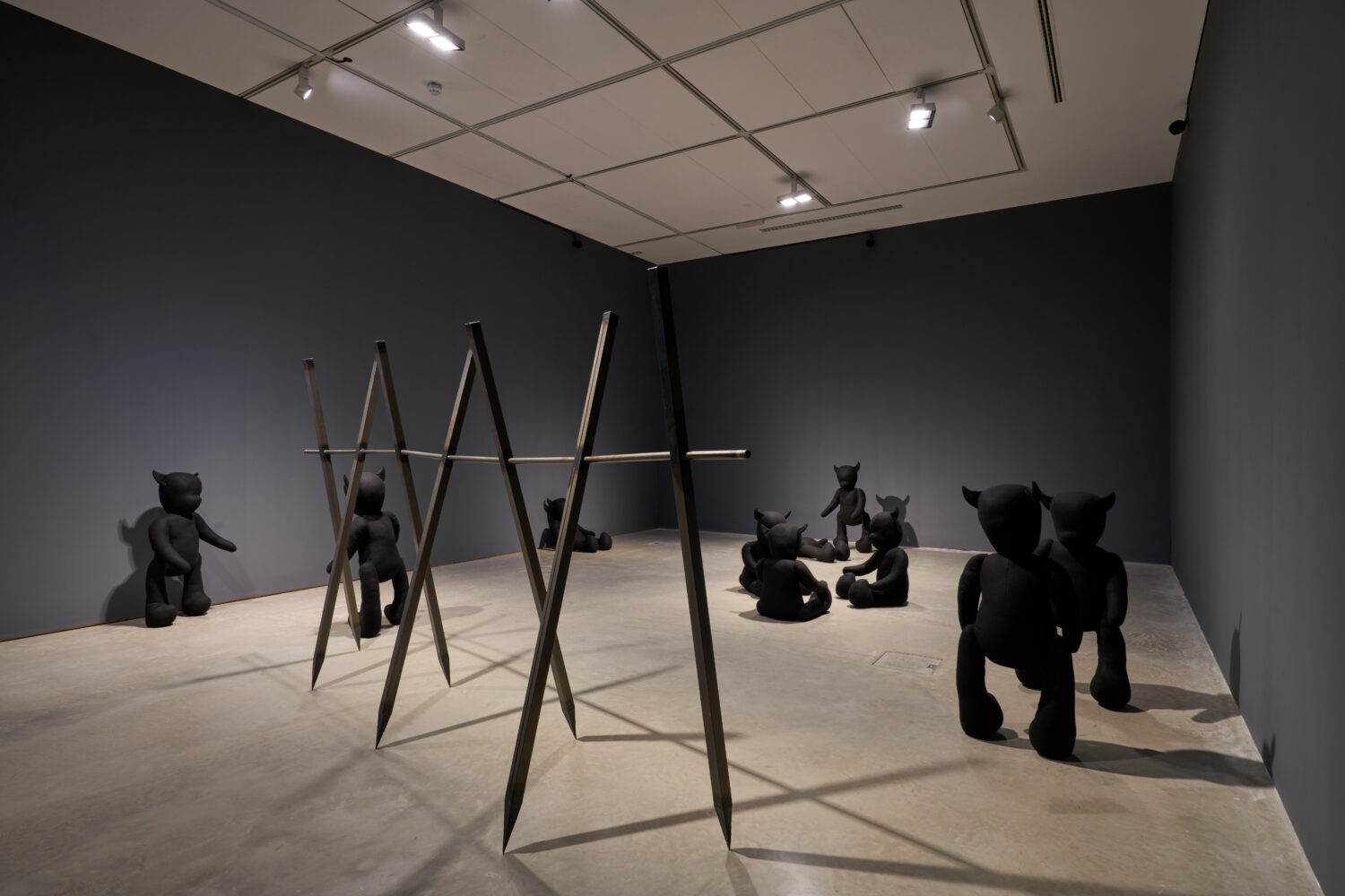 Hiding is also evident in the new installation of Ten Teddies (2017) for John Hansard Gallery; the first time they are located within a black space, is this a bad dream or personal trauma?