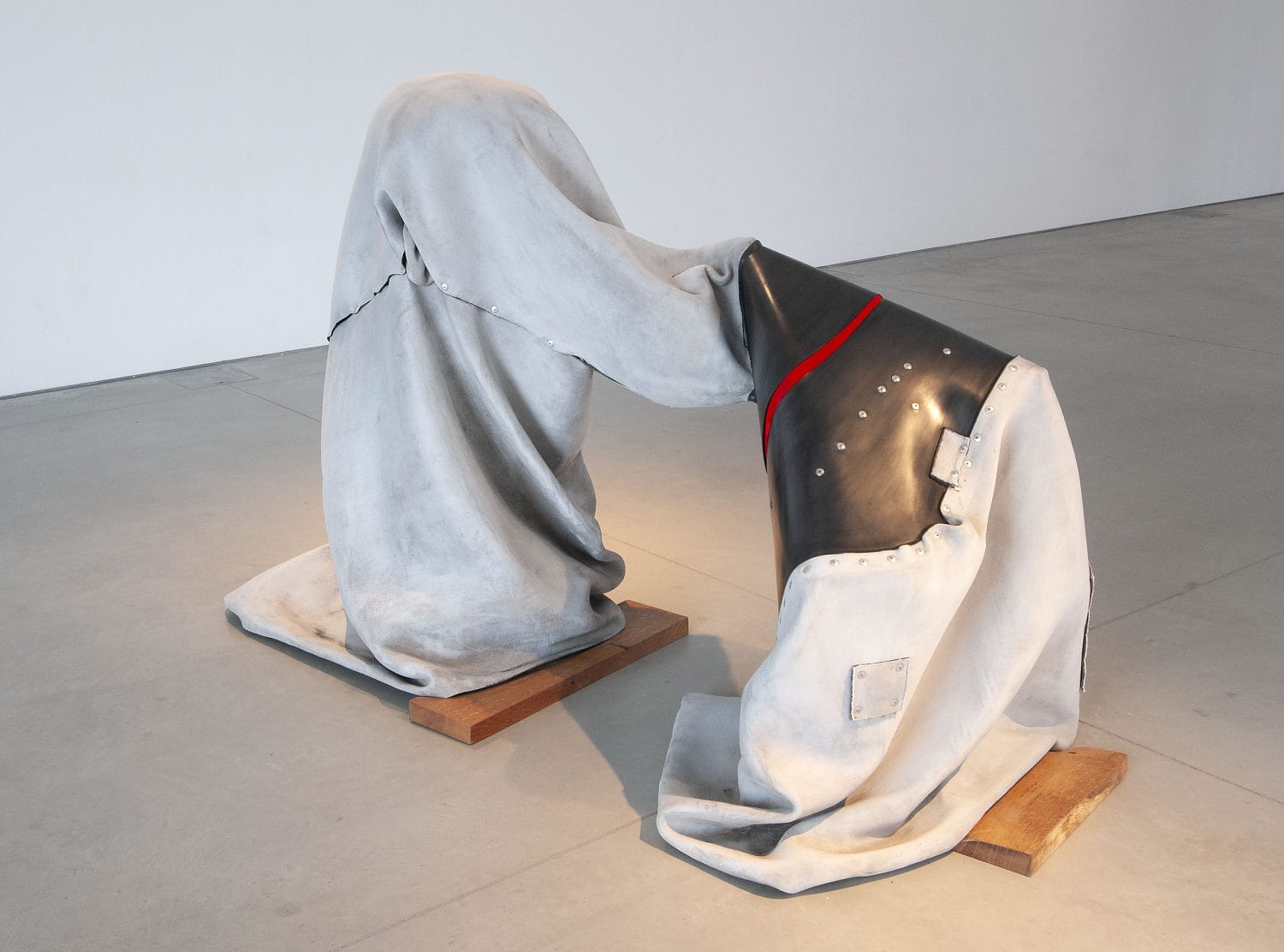 Across the sculptures on display, Hapaska introduces a diverse array of materials, including fibreglass, concrete cloth, artificial snakeskin, aluminium, oak, charcoal powder, wax and brass. Each of these materials is loaded with history and multiple readings, and Hapaska combines them in ways that are surprising and disconcerting.