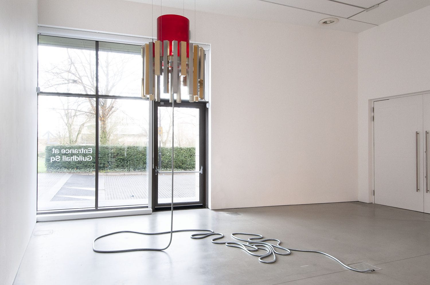 Biomorphic forms in concrete cloth reach towards one another, as if to touch (Love, 2016). Glossy fibreglass apples are constricted by snakeskin-veneered metal channels, ready to burst open at any moment (Snake and Apple, 2018). A sanctuary lamp floods the room with purple light, rotating in a perpetual state of crisis (Earthed, 2018). The build-up of carbon from incomplete combustion prevents giant candles from providing light (Candlewick, 2018).