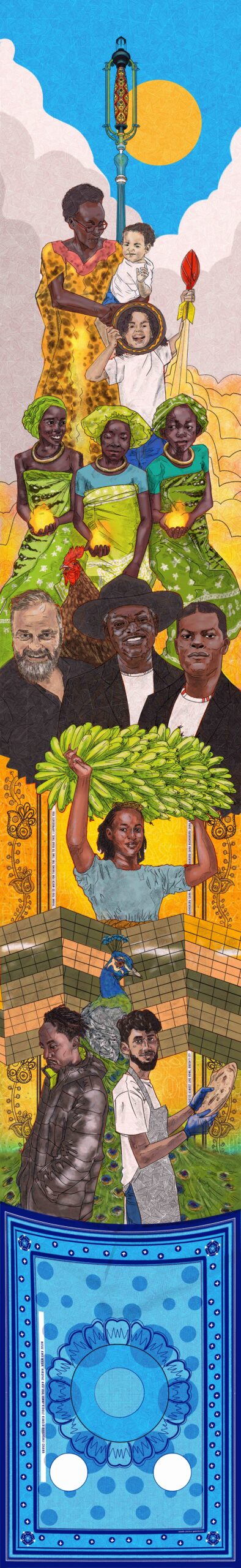 To create his design, Edgar used a combination of detailed observational drawings and conversations to depict Southampton residents, and included alongside them a Tanzanian proverb ‘Nifae kwa mvua Nikufae kwa jua kwani kidole kimoja hakivunji chawa’, which means ‘be (there) for me in the rain; I’ll be (there) for you in the sun because one finger cannot kill a louse.